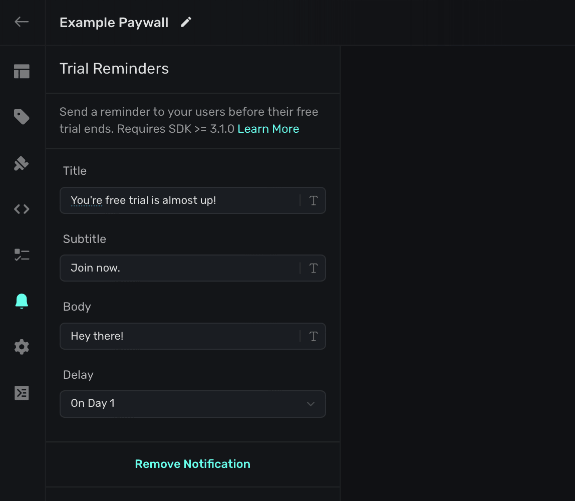 To turn on a trial reminder notification, click + Add Notification. From there, there are four fields to configure:
