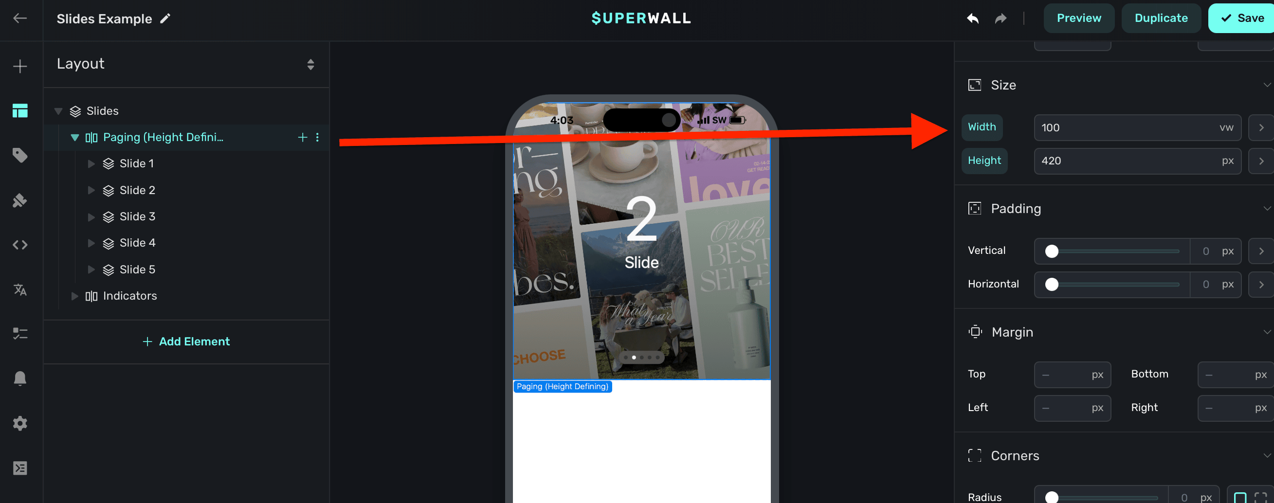 When a slides element is added, Superwall automatically creates an element variable for it (accessed through the Variables tab in the left sidebar, or the variables button in the floating toolbar). Its name will match whatever is in the element hierarchy in the left sidebar: