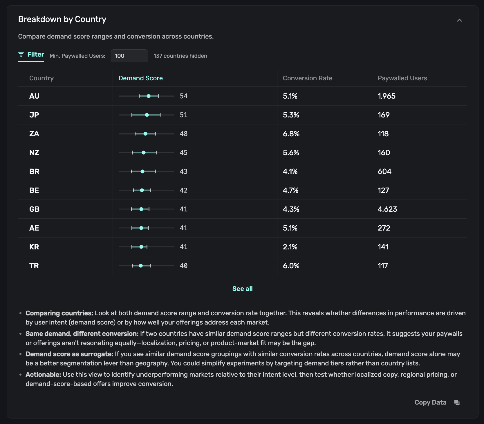 - Find underperforming markets. Countries with reasonable demand ranges but low conversion are candidates for localized pricing or copy experiments.